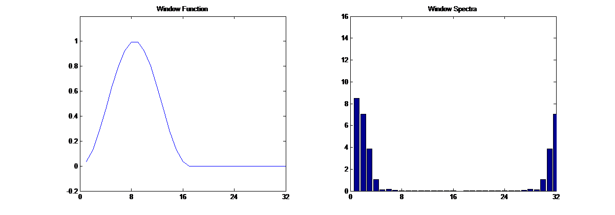 One such window is the Hann window (a.k.a. the Hanning window), which is shaped like half a sinusoid cycle. Its shape and spectra are illustrated above.