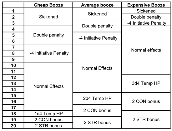 You gain the ability bonuses and penalties as noted for each kind of booze. In addition, you must roll on the Booze Penalties table for additional penalties.